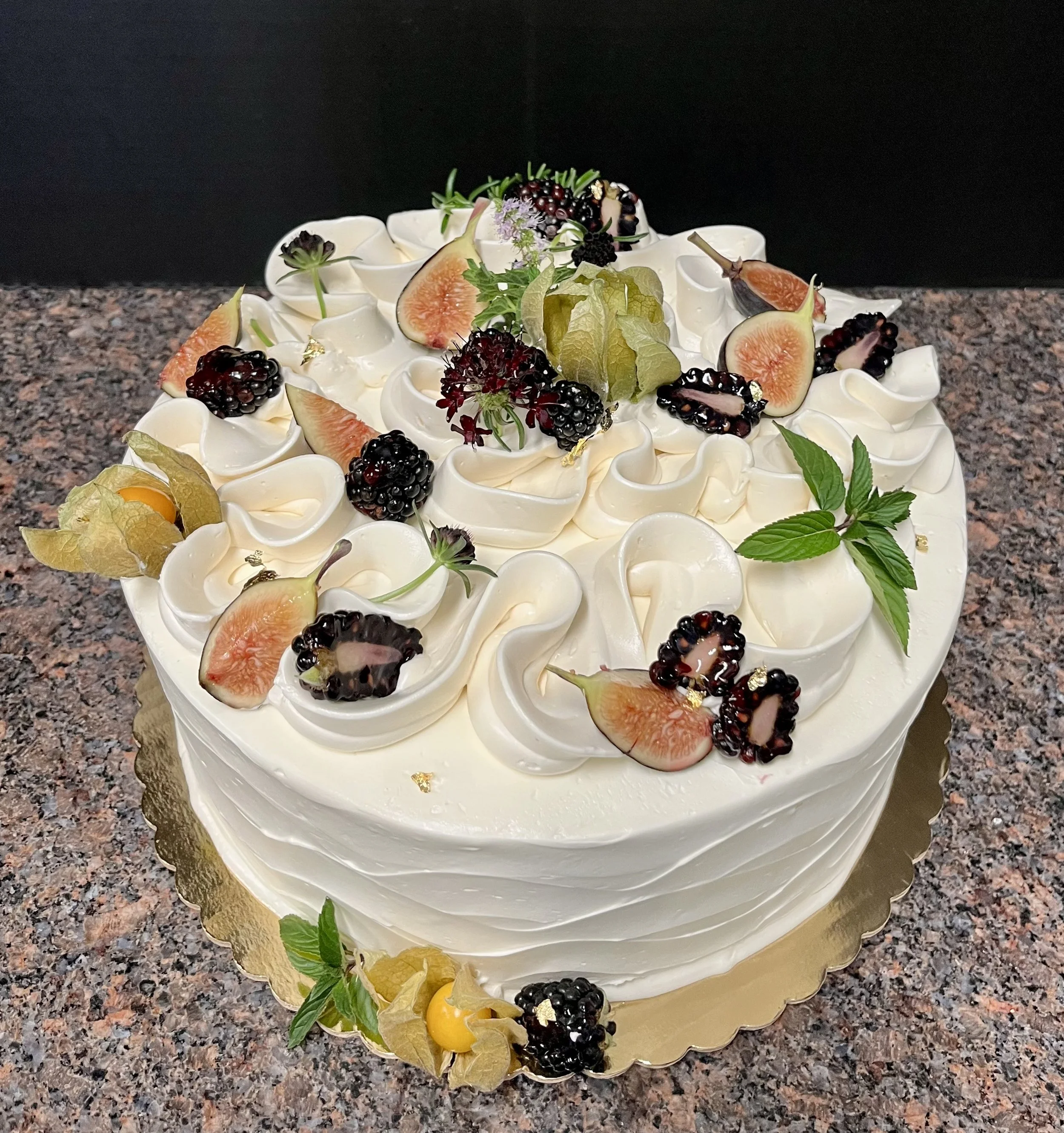 Vienna: Vanilla butter cake layered with a dark chocolate mousse. Choose from a silky vanilla Italian buttercream icing with either a chocolate ganache drip, or all vanilla buttercream (please specify when ordering).